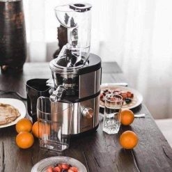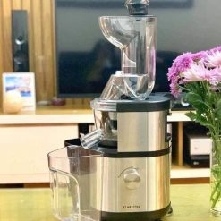 - Ống dẫn hoa quả có bề rộng mặt lên tới 8,5cm chứa toàn bộ trái cây trong 1 lần ép mà không cần cắt nhỏ hay đứng canh để cho hoa quả vào liên tục